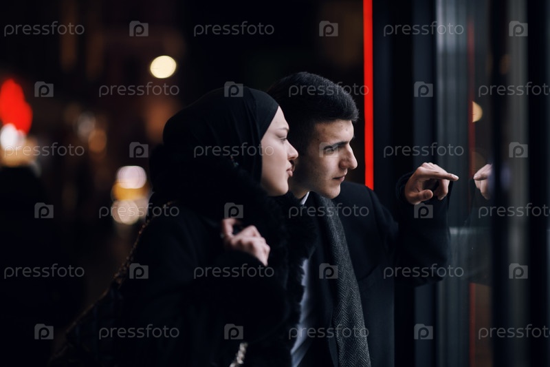 Счастливая мультикультурная деловая пара прогуливается вместе на улице города ночью возле витрины ювелирного магазина