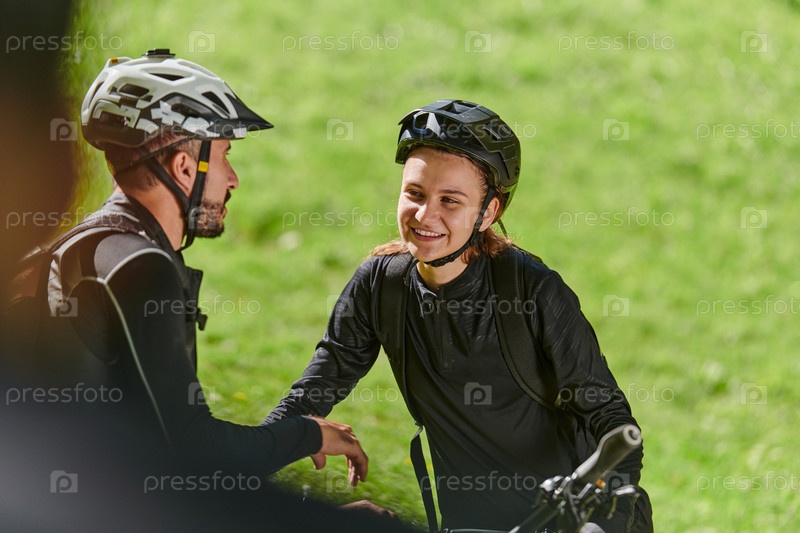 Милая парочка, вооруженная велосипедами и поглощенная планированием своего путешествия, проверяет свои мобильные телефоны и часы, планируя живописные маршруты в парке, органично сочетая технологии и приключения на свежем воздухе для восхитительного опыта