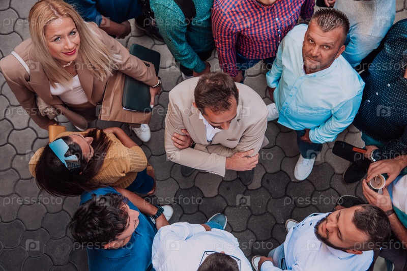 Фотография сверху группы бизнесменов и коллег, стоящих вместе и смотрящих в камеру, символизирующая единство и командную работу