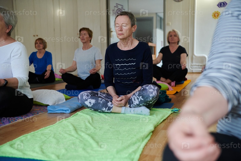 Группа пожилых женщин занимается различными упражнениями йоги, включая растяжку шеи, спины и ног, под руководством тренера в залитом солнцем месте, способствуя благополучию и гармонии