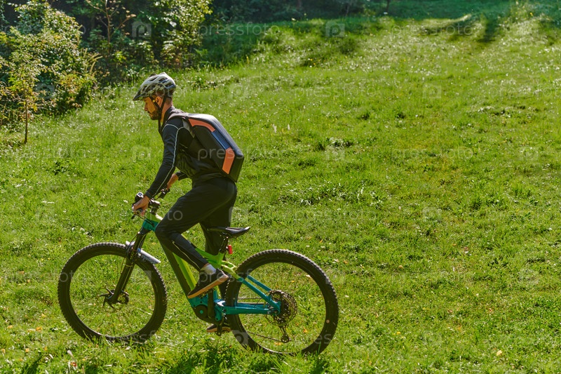 В ярком сиянии солнечного дня любитель фитнеса, одетый в профессиональную экипировку, крутит педали велосипеда по парку, воплощая силу и жизненную силу в динамичной тренировке на открытом воздухе