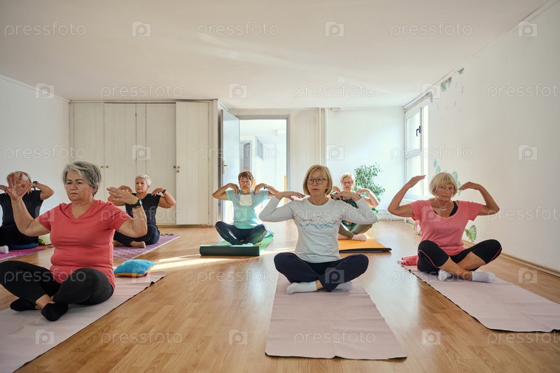 Группа пожилых женщин занимается различными упражнениями йоги, включая растяжку шеи, спины и ног, под руководством тренера в залитом солнцем месте, способствуя благополучию и гармонии