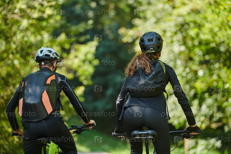 Счастливая пара, одетая в профессиональную велосипедную экипировку, наслаждается романтической велопрогулкой по парку, окруженному современными природными достопримечательностями, излучая любовь и счастье