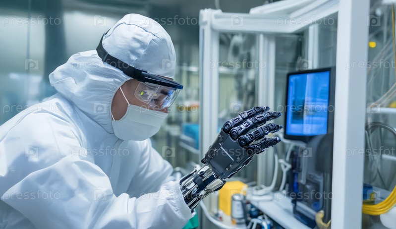 Инженер-робототехник калибрует роботизированный протез руки, демонстрируя передовые медицинские технологии. Сгенерированное изображение