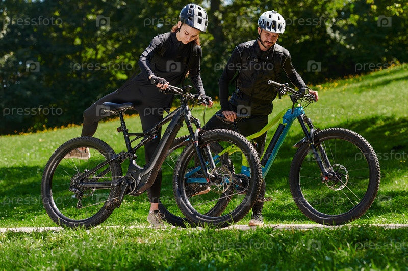 Милая парочка, вооруженная велосипедами и поглощенная планированием своего путешествия, проверяет свои мобильные телефоны и часы, планируя живописные маршруты в парке, органично сочетая технологии и приключения на свежем воздухе для восхитительного опыта