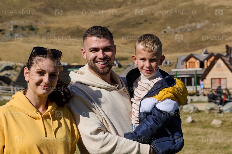 Современная семья вместе со своим сыном наслаждается радостью грязного дня на природе, бегая и играя вместе, воплощая в себе красоту здорового и активного образа жизни
