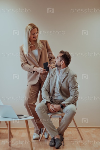 Пара бизнесменов позирует для совместной фотографии на бежевом фоне, запечатлевая свое профессиональное партнерство и создавая вневременной образ единства и успеха