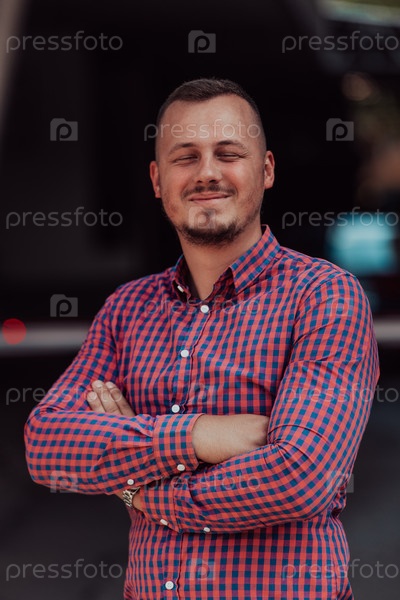 Успешный молодой бизнесмен в рубашке, скрестив руки, позирует на открытом воздухе с уверенным выражением лица