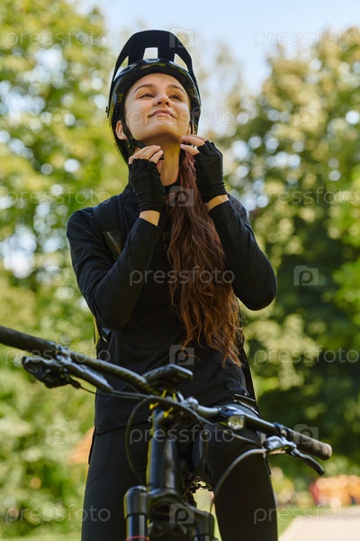 В лучезарных объятиях солнечного дня радостная девушка, облаченная в профессиональную велосипедную экипировку, обретает чистое блаженство и жизненную силу, катаясь по парку на своем велосипеде, а ее заразительный смех отражает беззаботную гармонию момента