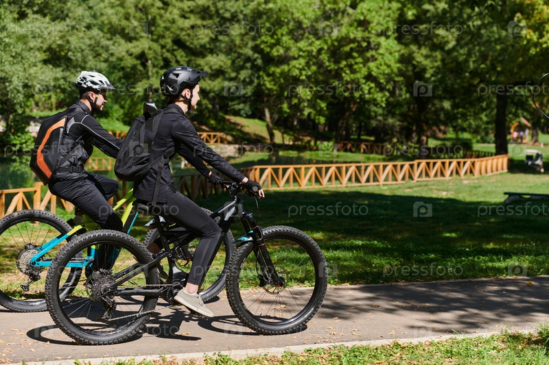 Счастливая пара, одетая в профессиональную велосипедную экипировку, наслаждается романтической велопрогулкой по парку, окруженному современными природными достопримечательностями, излучая любовь и счастье