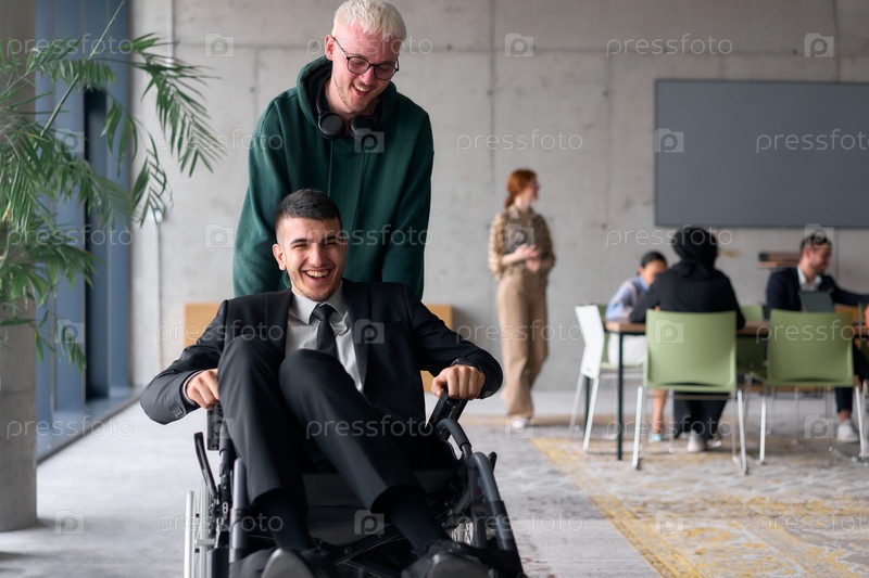 Сотрудник развлекает директора в инвалидной коляске, катаясь по офису со смехом и радостью