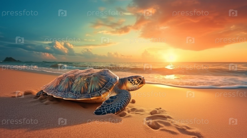Маленькая морская черепаха на песчаном пляже утром