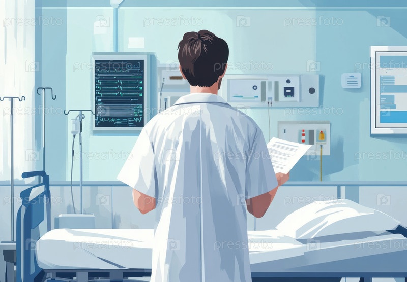 Врач анализирует данные пациента в современной больничной палате