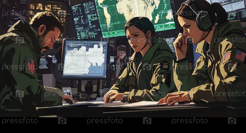 Напряженная сцена, изображающая военнослужащих, участвующих в критически важных сессиях по планированию стратегии в командном центре, где глобальные карты облегчают процессы принятия решений.Сгенерированный нейросетью контент, ИИ