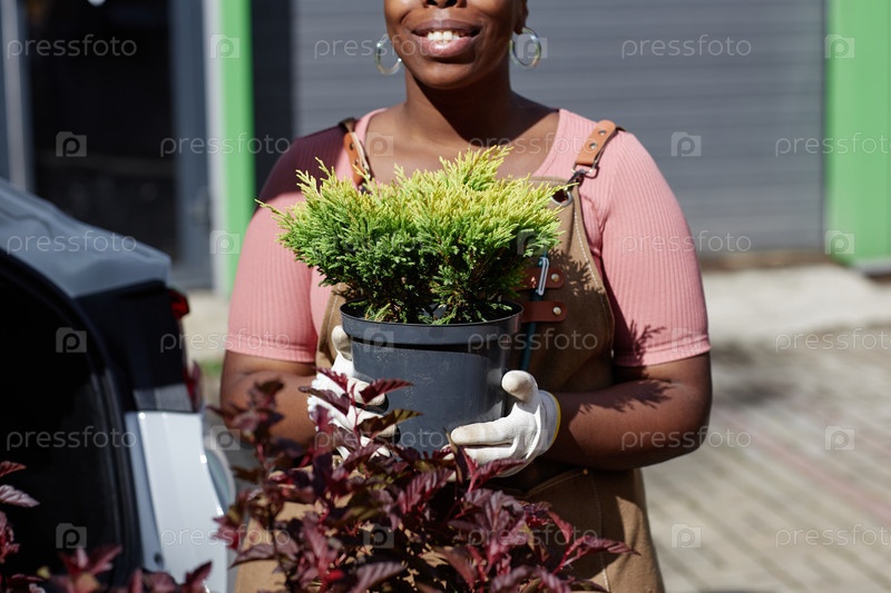 Черная женщина, работающая в питомнике с растениями, держит горшок Thuja загружает куст в багажник автомобиля на улице
