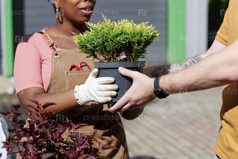 Работница питомницы растений передает горшок с туйей черной женщине в садовом центре