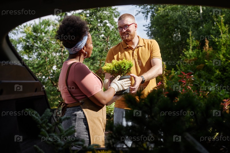 Чернокожая женщина передает человеку кустарник из кастрюли туджи, работая на открытом воздухе в питомнике растений