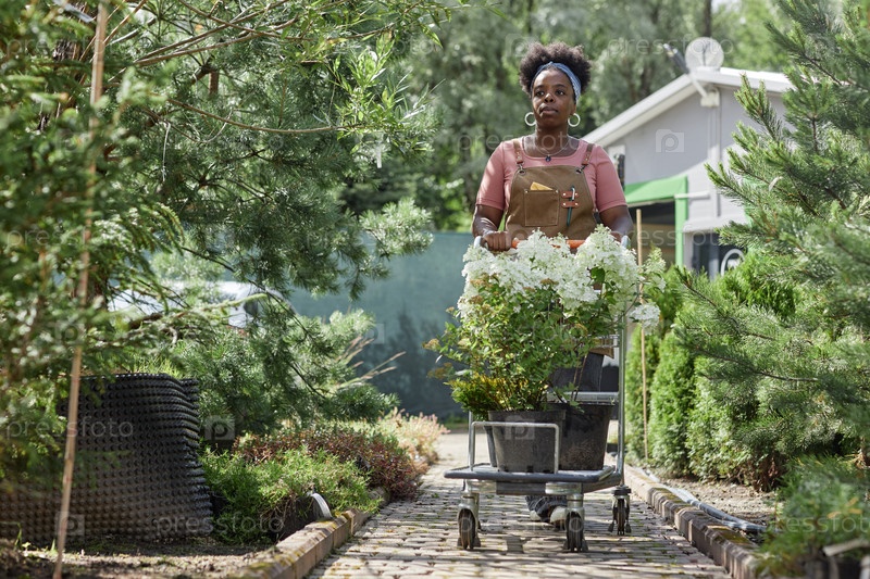 Черная садовница толкала корзину с цветами, работая в питомнике растений