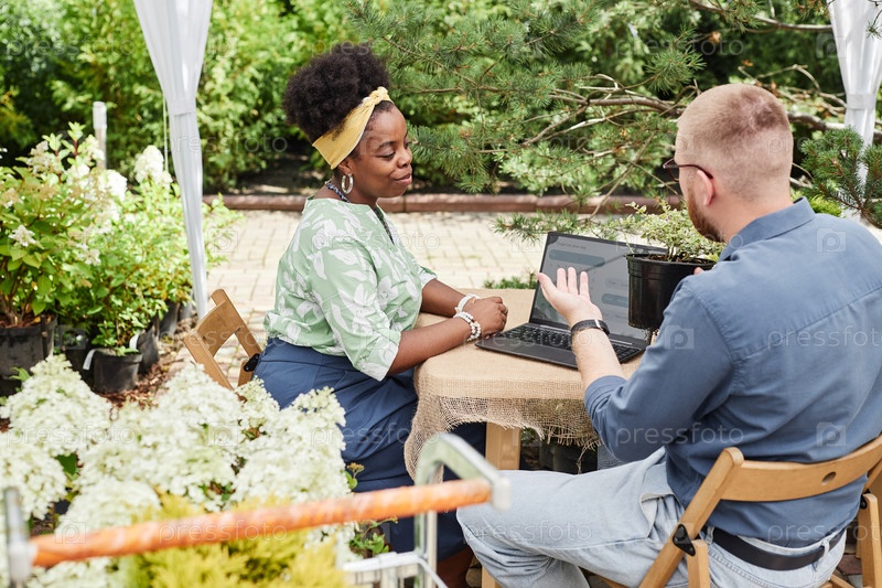 Черная женщина ландшафтный архитектор обсуждает дизайн сада с мужчиной клиента на открытом воздухе