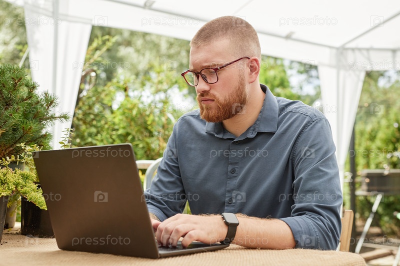 Фокусированный мужской ландшафтный дизайнер с помощью ноутбука работает онлайн в саду