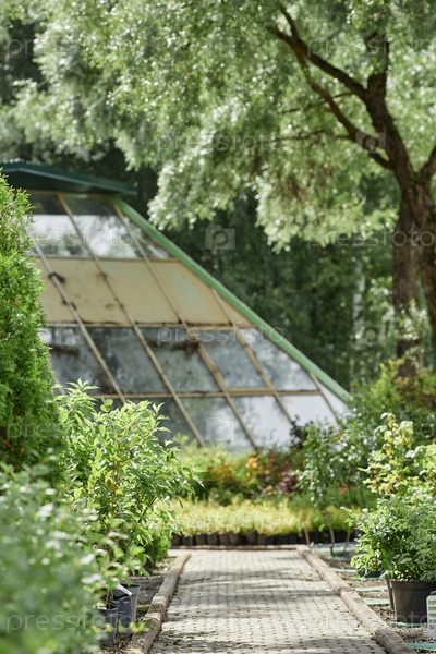 Каменный путь в садовом питомнике растений Погруженные в пышную зеленую природу на свежем воздухе