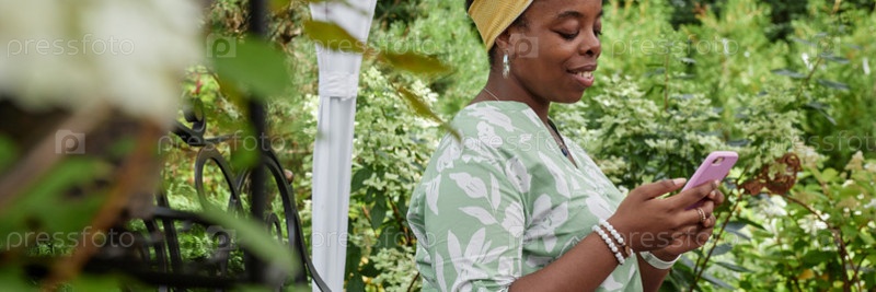 Header Image of Улыбающаяся чернокожая женщина, использующая телефон Работает онлайн в саду