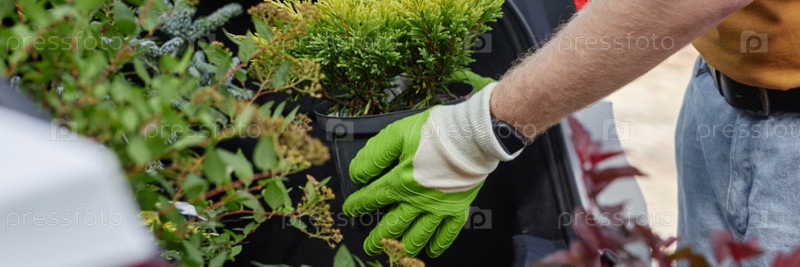 Header Image of Руки мужчины в перчатках загружают горшочное растение в багажник автомобиля на открытом воздухе