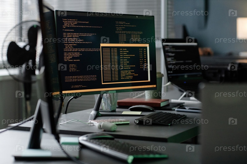 Экран отображения строк кода компьютера на рабочей станции программистов в Office