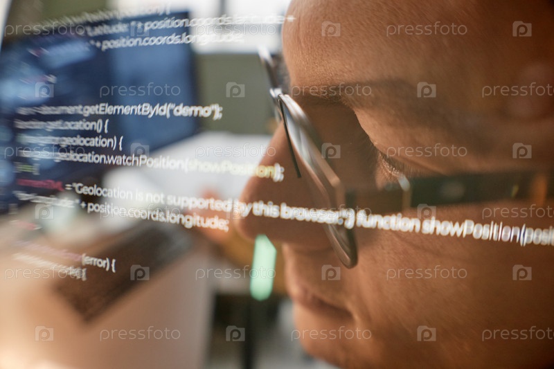 Лицо мужского разработчика с очками, глядящего на компьютерный экран с помощью программного кода
