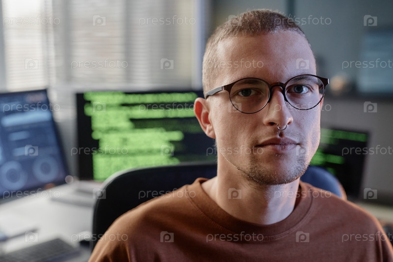 Портрет взрослого мужского ИТ-программиста с очками и септом, позирующего в офисе