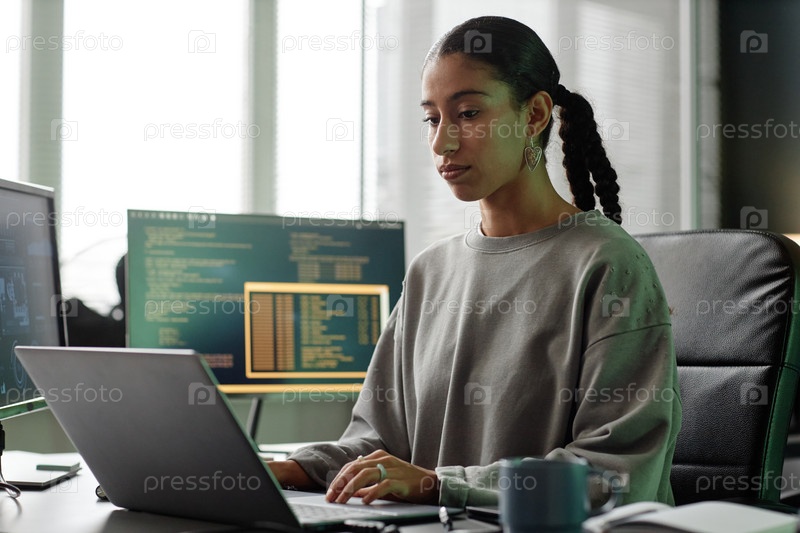 Ближневосточная женщина-программист использует ноутбук, сидя на рабочей станции в офисе