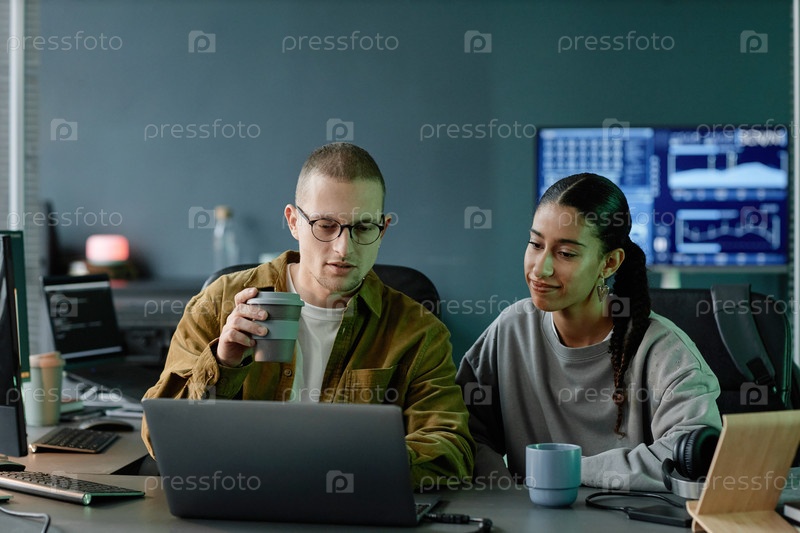 Команда из двух позитивных программистов с помощью ноутбука обсуждает код отладки в Office