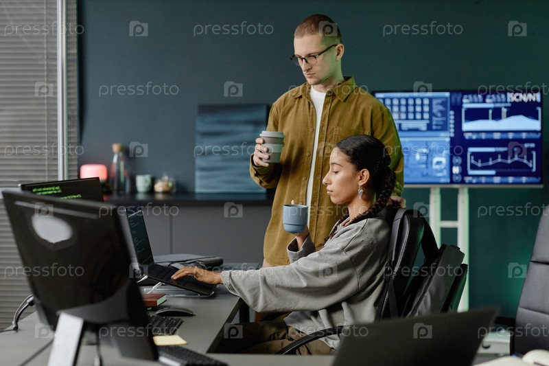 Женщина-программист, использующая ноутбук Сотрудничает с коллегой на работе На встрече в офисе