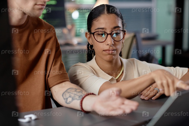 Портрет женского ИТ-программиста, помогающего коллеге-мужчине во время сотрудничества в офисе
