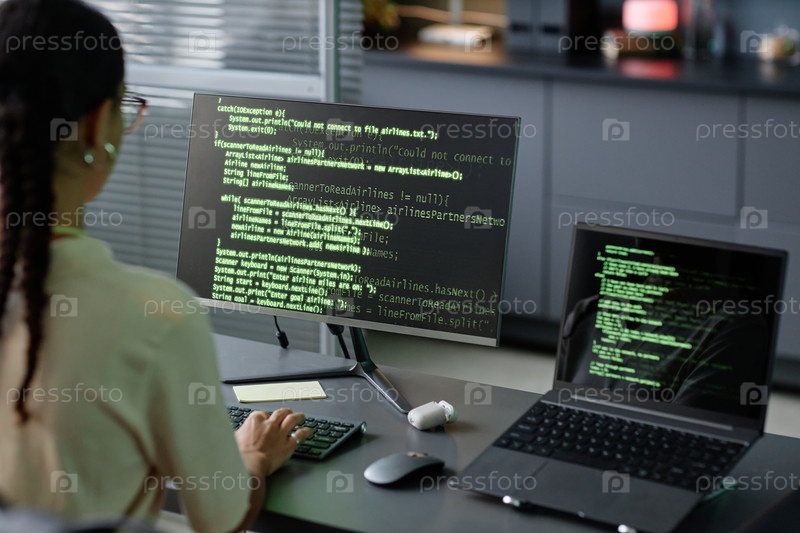 Женская ИТ-программистка кодирует на компьютерах с использованием нескольких экранов на рабочей станции в офисе