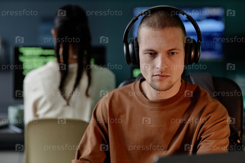 Портрет мужского ИТ-разработчика в наушниках Кодирование на ноутбуке во время работы в офисе с коллегами