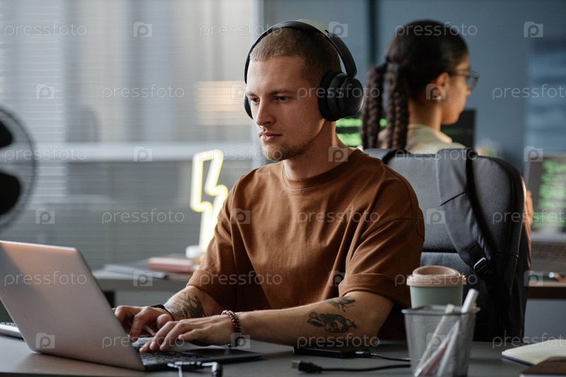 Умелый мужской ИТ-разработчик, носящий наушники, пишущий код на ноутбуке Работающий в помещении