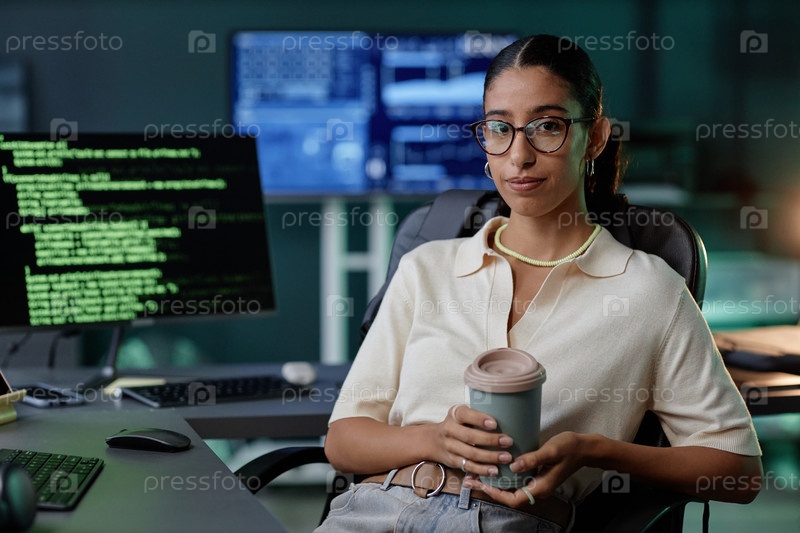Портрет улыбающейся ближневосточной женщины-программистки, сидящей на стуле за рабочим столом в офисе
