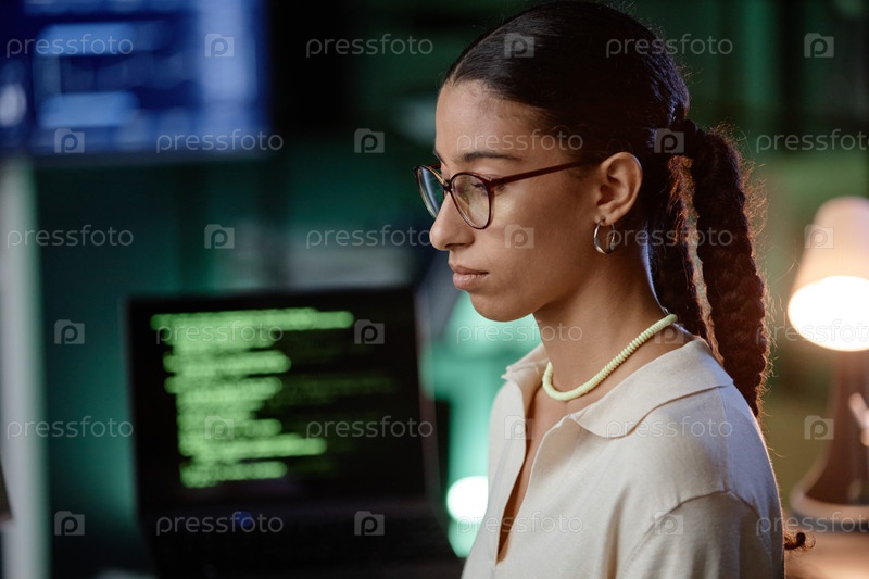 Портрет ближневосточной женщины-иТ-разработчика с очками, использующей компьютер на рабочем месте