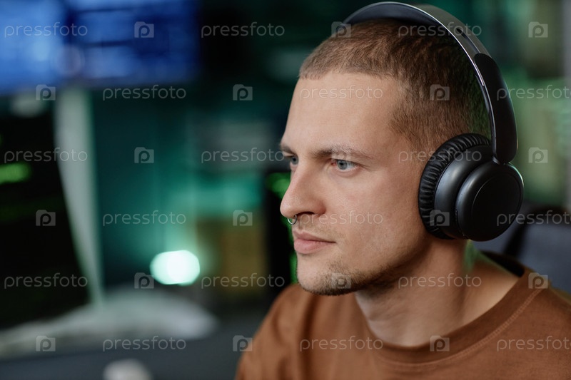 Портрет взрослого мужского ИТ-программиста с септумом, носящего наушники и работающего в офисе