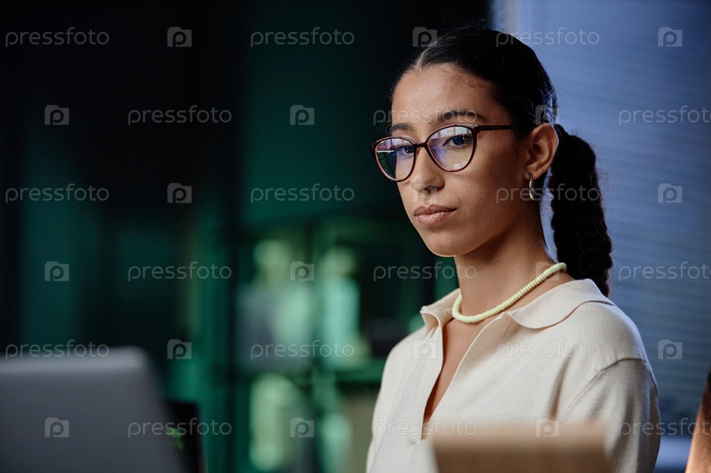 Портрет ближневосточной программистки с очками, использующей компьютер на рабочем месте