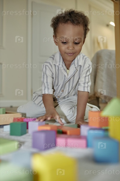 Счастливый ребенок дошкольного возраста играет с строительными блоками на полу дома
