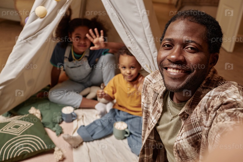 Улыбающийся чернокожий мужчина делает селфи с маленькой дочерью и сыном, играющими в домашнем чайнике