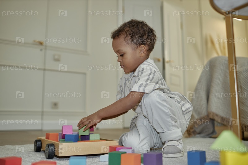 Сосредоточенный ребенок дошкольного возраста играет с строительными блоками на полу в игровой комнате дома