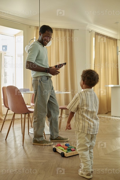 Счастливый папа смотрит, как маленький черный ребенок играет с игрушками в помещении