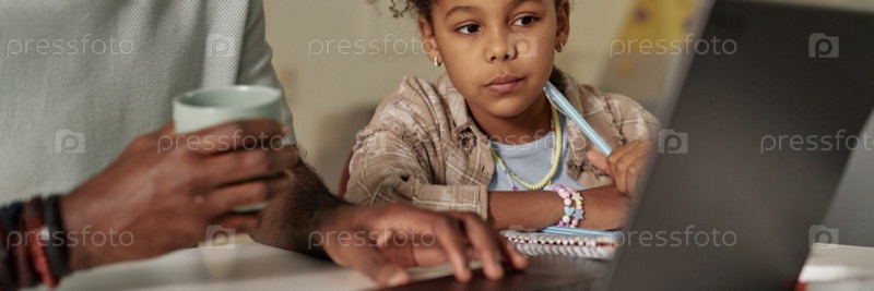 Header Image of Черная девушка смотрит, как папа использует ноутбук во время выполнения домашних заданий Вместе дома