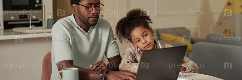 Header Image of Черный мужчина печатает на ноутбуке, учит дочь пользоваться компьютером дома