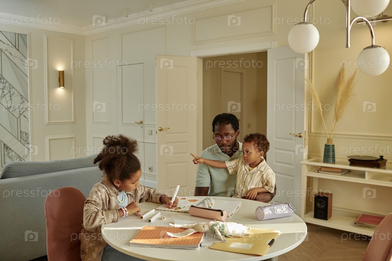 Чернокожий мужчина держит маленького сына Родительские дети, рисуя за столом в гостиной