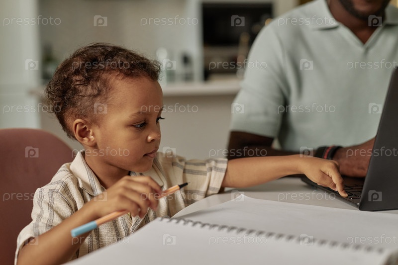 Молодой чернокожий мальчик нажимает кнопку ноутбука, исследуя технологии в раннем возрасте дома