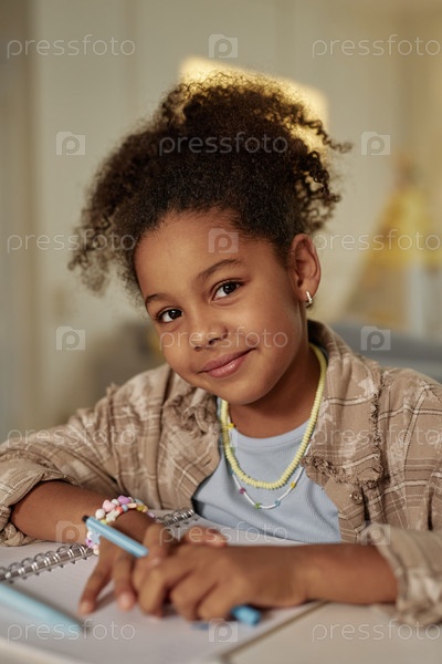 Портрет улыбающейся молодой чернокожей девушки, сидящей за столом во время учебы дома